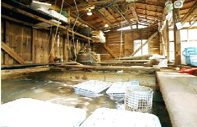 。 カネジョウ商店のイケスです。約50メートル先の海から 海水を常時汲み上げています。作ってから30年近くたっているので 新しいイケスを考えています。伊勢エビ サザエは常時新鮮な海水が必要です。 町中の循環の水槽では本当の味は出ません。 この右側にはアワビを活かす冷却水槽が有ります。アワビは水温が15度を 越えると非常に死にやすくなるのでしかたなく、夏は海水を冷やしています。 平成12年7月まで使用。