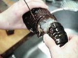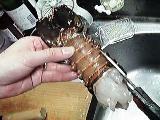 伊勢海老は頭と胴を持ってねじり、ひっぱって頭とを分ける。