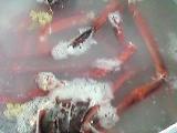 殻、頭はブツ切りにし、足は包丁の腹で軽く叩いて鍋に入れ、水と酒を加えて火にかけ、沸騰したら20分ほと煮込んで出汁をとる。