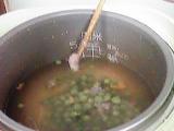 炊飯器に、洗っておいた米、殻でとった出汁、酒、塩、しょう油を入れて軽く混ぜ、グリーンピースを乗せ、叩いた伊勢海老の身を少しずつ菜箸ですくって、釜の縁で箸をポンとたたき、釜の中に身を落とし入れていく。
