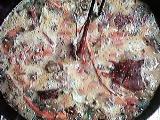 色が変わってきたら、にんじん、たまねぎ、セロリ、にんにくを加えて更に炒め、野菜に火が通ったらブランデーと白ワインを注ぎ、鍋に張り付いた旨みをこそぎ取ったらトマトとトマトピューレを加え、水を加えて、コトコトと20分程度煮込む。