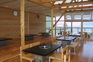 左側の小上がり部分に掘り炬燵式の無煙ロースター3台