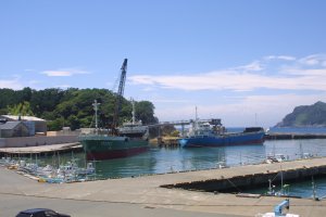昼の景色 奥の船は東海工業の珪石を積みに来る船。以前はガラスの原料として 利用されましたが、現在は軽量建材の材料として利用されています。 手前の船は深田地区で掘り出された岩石を積む船です。 |
