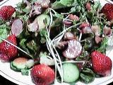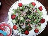 - ドレッシングを作ります。イチゴは裏ごしをし(うちはこし器が無いのでミソこしでやっています)、レモン汁・酢・サラダ油・塩・砂糖を加えてよく混ぜます