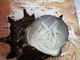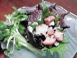 紫蘇の葉を乗せ、その上に切り分けたサザエの身とヒモを盛り付ける