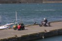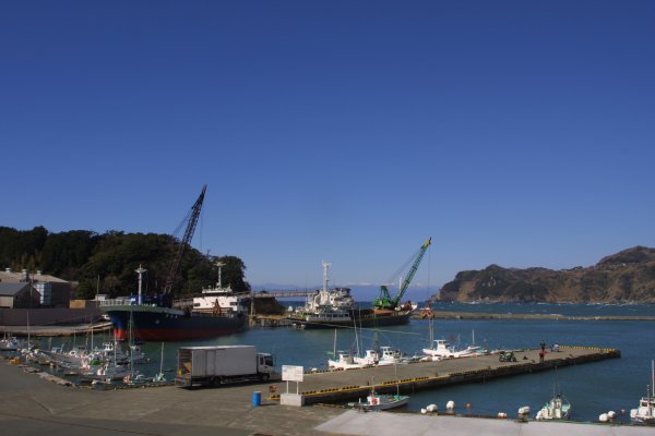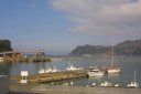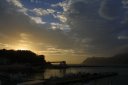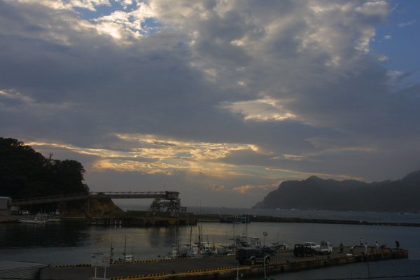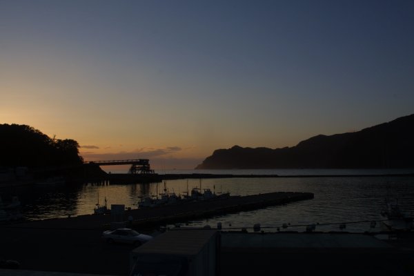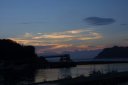 ベランダからの風景です。夕日は直接見えませんが色々な顔を見せてくれます。 左の桟橋には珪石を運ぶ船と採石を運ぶ船が出入りしています。目の前の桟橋には夏から秋は ヨット クルーザーが泊まっています。平成15年の冬はバイク雑誌が撮影に使ったようで 良くバイクの人たちが西風が吹きまくる中撮影していました。