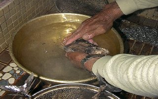 大きな鍋にたっぷり水を入れ 沸騰させてからウズワを 入れる。大きさによって 10分から20分茹でる。 中に赤身が残っている ようではだめ。とにかく 生ゆでは禁物 ここで雑節の品質が きまる。茹であがったら 水で冷やす。できれば 流水で。 |