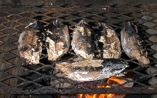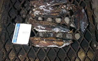 水からあげたら弱火で 燻す。写真では近火に見えるが 実際には離れている。我が家の 古い燻し場は深さ2メートル 以上ある。裏表返すのを 忘れずに。 |